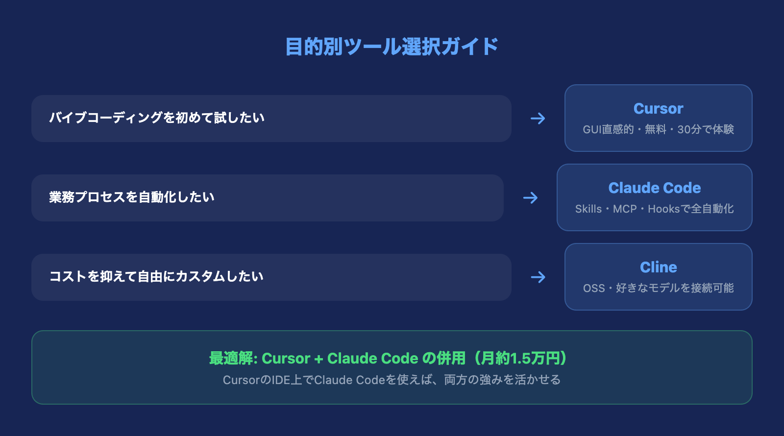 - 入門はCursor(直感的・無料)から始める