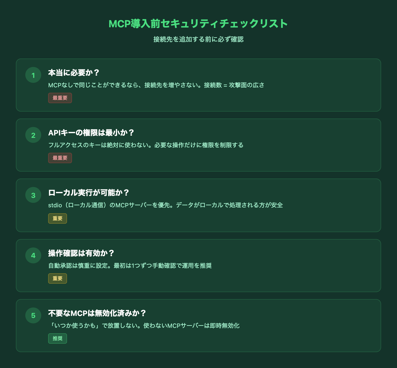 MCPは便利ですが、AIに外部システムへのアクセス権を与えるということでもあります。セキュリティの考え方を整理しておきましょう。