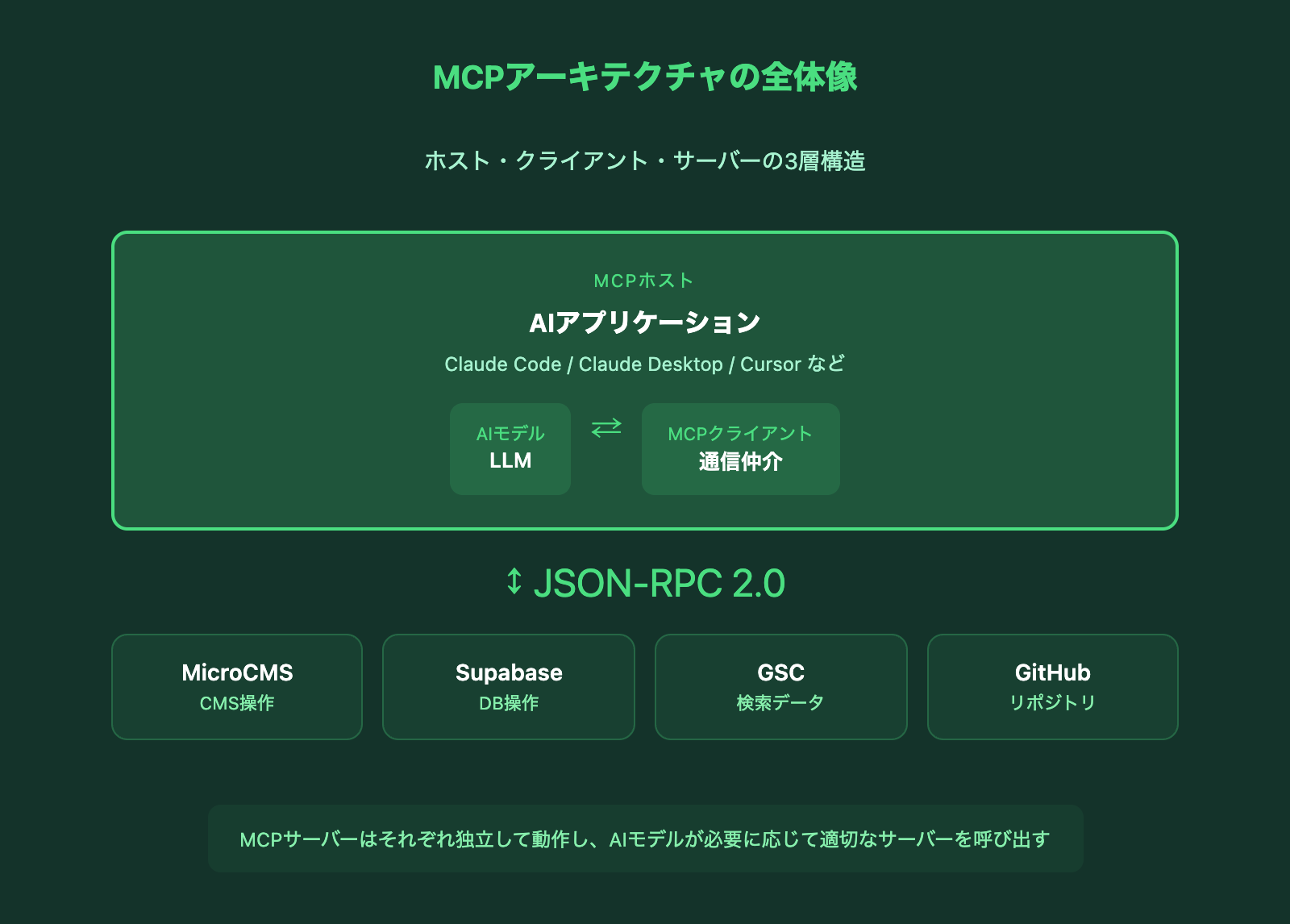 - MCPサーバー: 外部システム(データベース・CMS・APIなど)への接続を提供するサービス