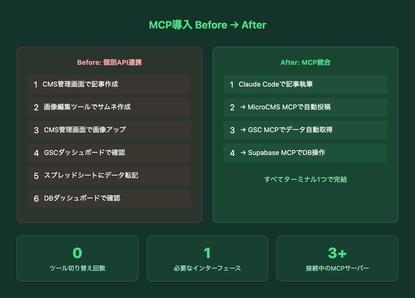 これらの作業を個別のツールで行っていた頃と比べると、ツール間の切り替え時間がゼロになったのが最大の変化です。Claude Codeというターミナル1つの中で、調査も制作もデプロイも完結する。この「ワンストップ」感がMCPの本質的な価値です。